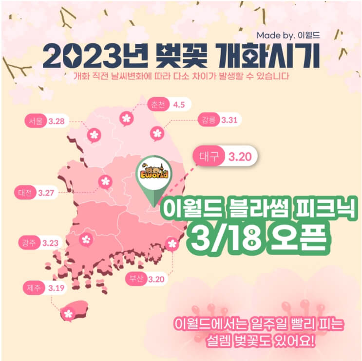 - 전국에서 가장 빠른 벚꽃 개화 장소이자 여의도 윤중로보다 3배 많은 벚꽃나무들이 있어 국내 최대 야간 벚꽃을 즐길 수 있는 이월드에서 벚꽃축제가 개장합니다.